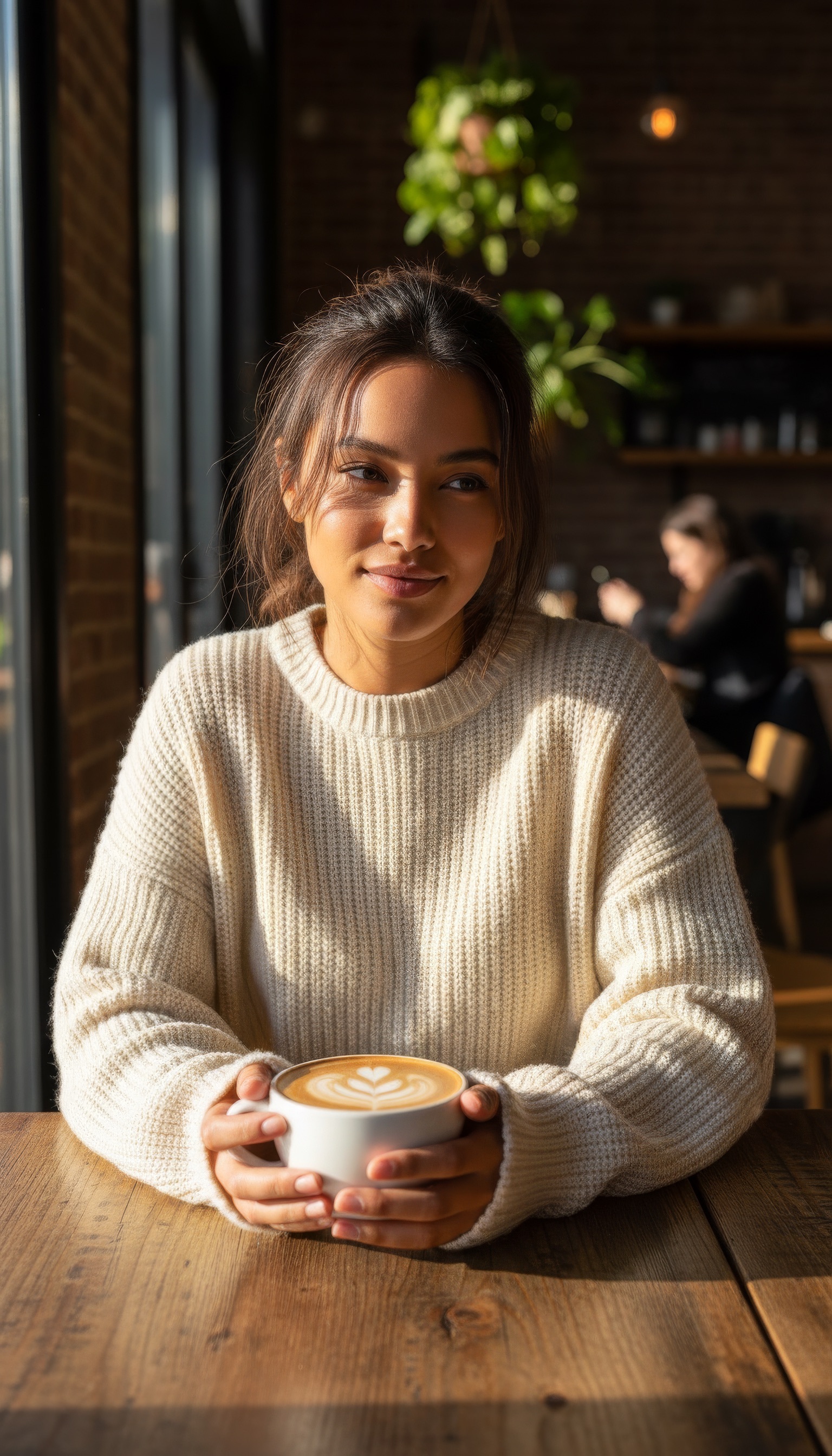 Casual morning vibe, natural lighting, relaxed bedroom setting